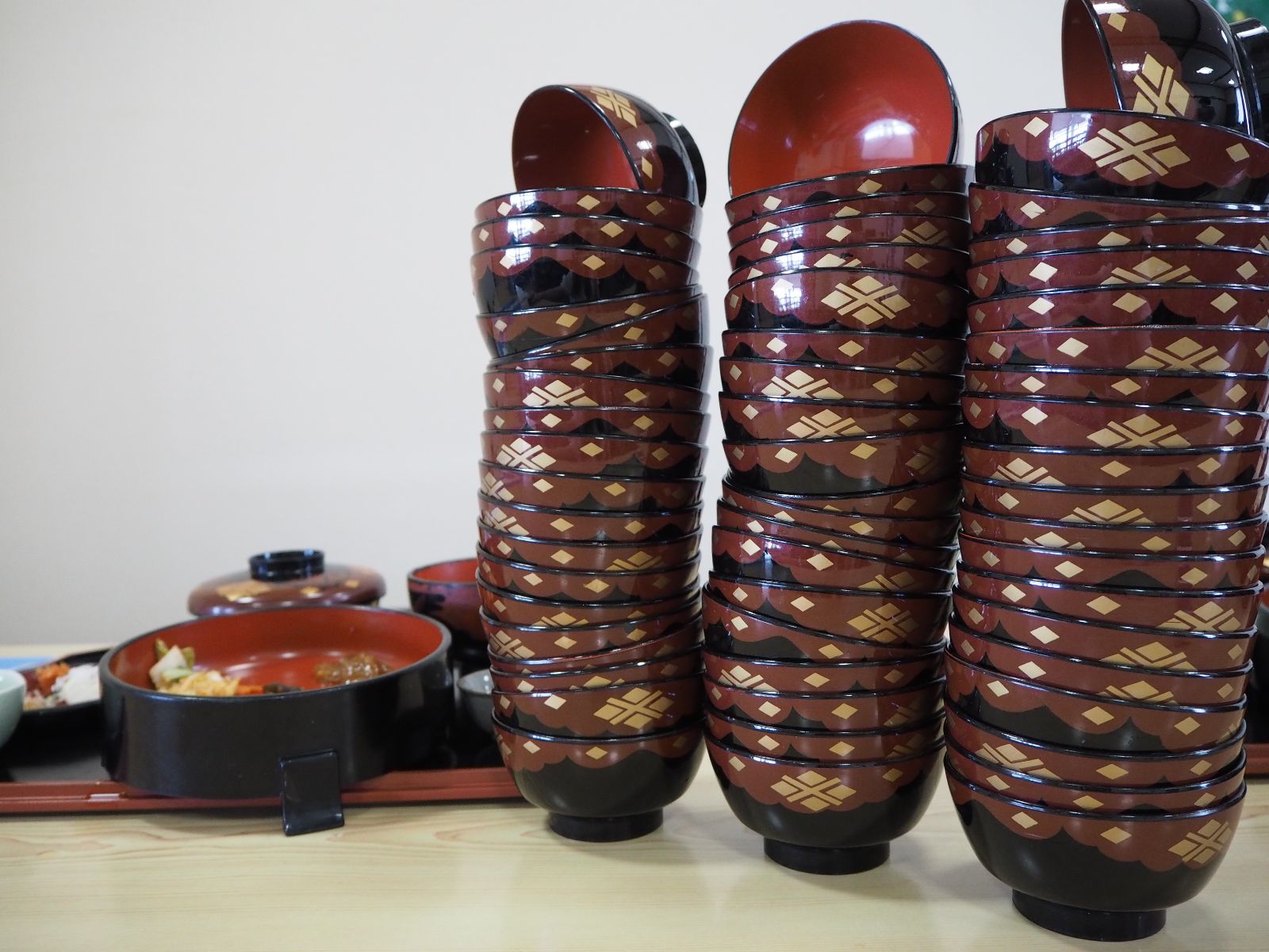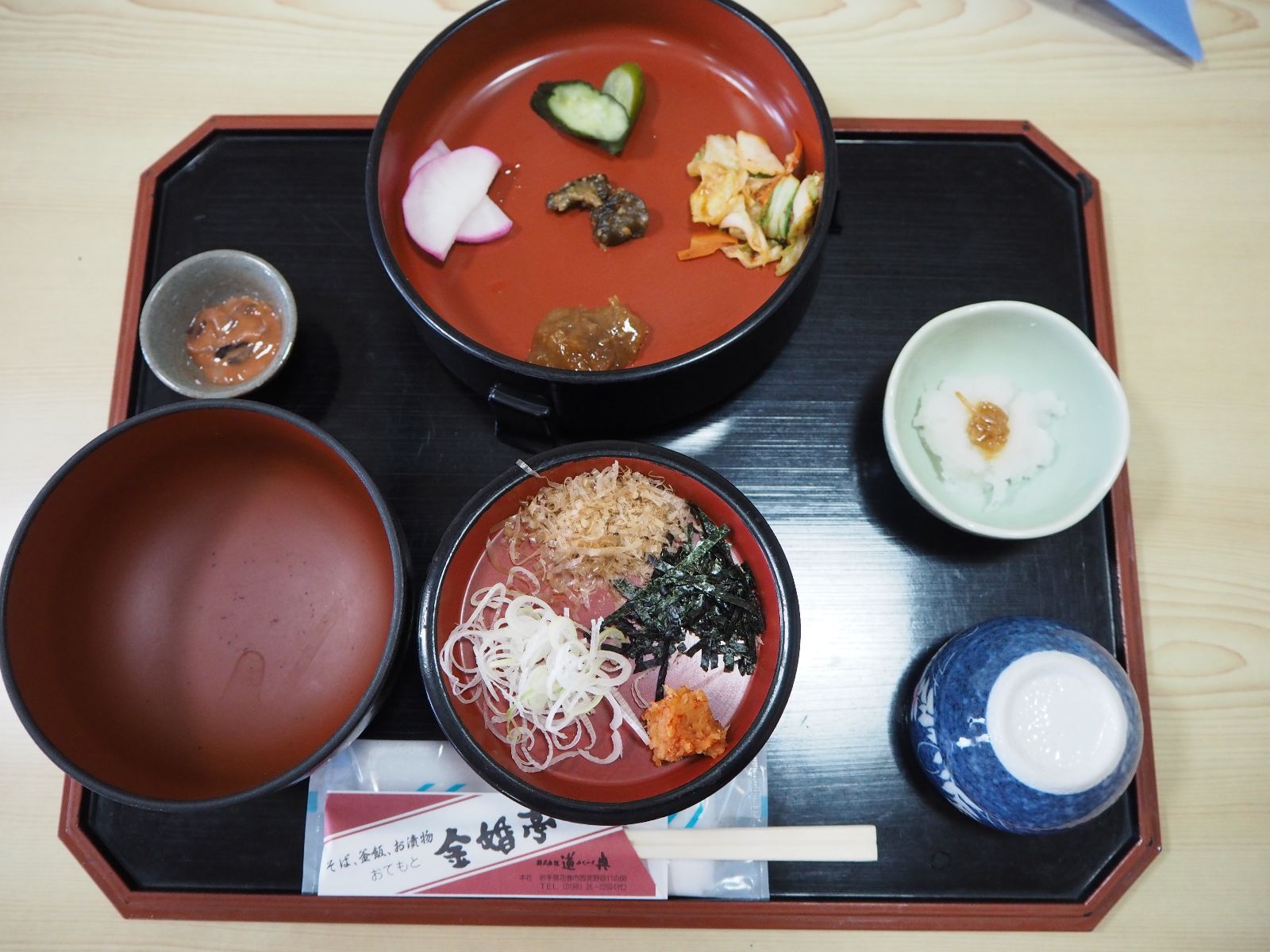 為了重現這個景象,金婚亭特別準備宛如武士造型的圍兜兜,讓每個來吃麵的遊客彷彿都變成日本武士般。一口蕎麥麵的起源眾說紛紜,每個店家也發展出不同的特色配菜與吃法,金婚亭在用餐前會敲打太鼓宣告將正式開吃,相當有氣勢!