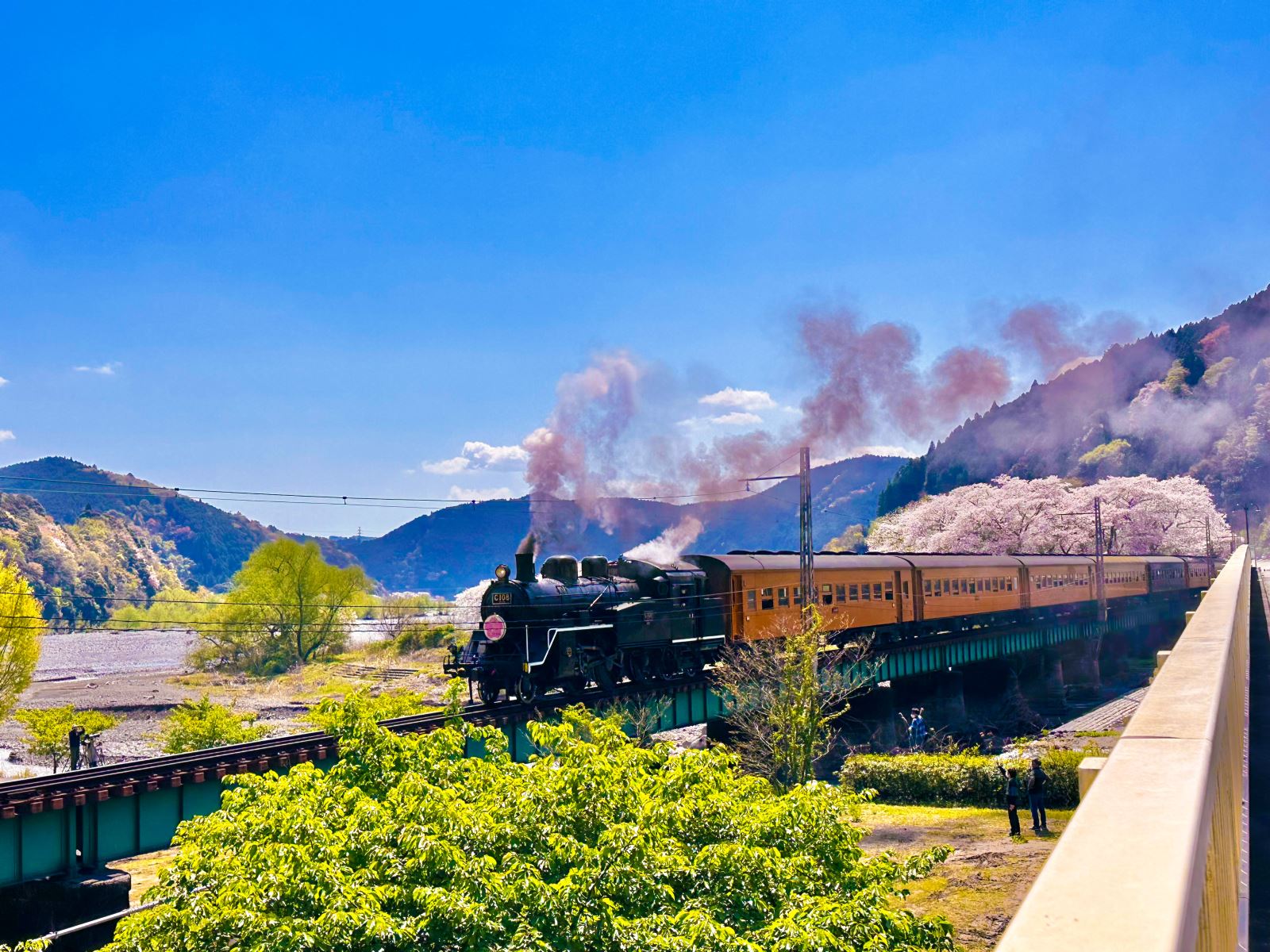 從島田市發車的大井川鐵道,是受到鐵道迷歡迎的在地小火車路線,尤其是班次極少的蒸汽小火車更是人人爭睹的車款。每逢櫻花季,總有超多追火車的攝影愛好者跑來家山車站,就為了拍攝SL蒸汽火車穿過滿開櫻花的畫面,最佳攝影位置在車站徒步10分鐘可達的家山橋上、以及橋下的河堤。