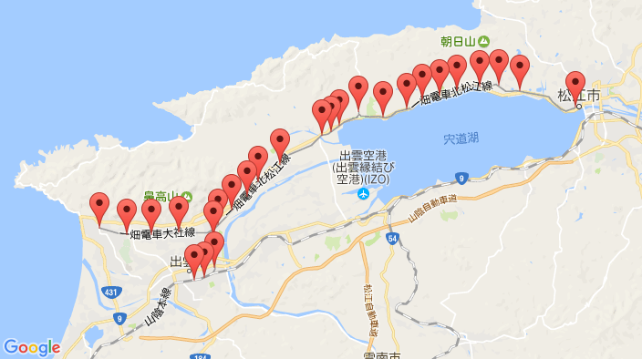 路線從松江市沿著夕陽美景超有名的宍道湖一路延伸到出雲地區。