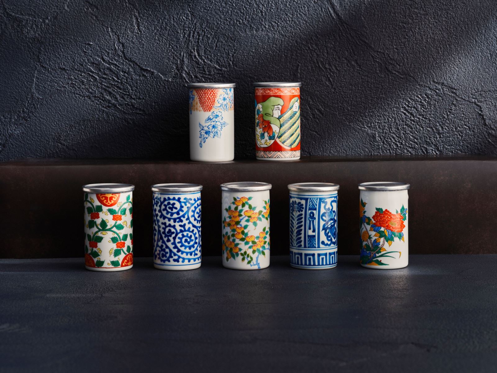 古伊萬里酒造藏元「前田家」睽違十多年的新企畫,特別從代代相傳的器皿中選定「櫻錦」、「變身不倒翁」,經由有田燒彩繪師的巧手,重現在圓柱形的有田燒杯酒上。目前以二合一組合方式販售,每組5,500日圓(含稅)。