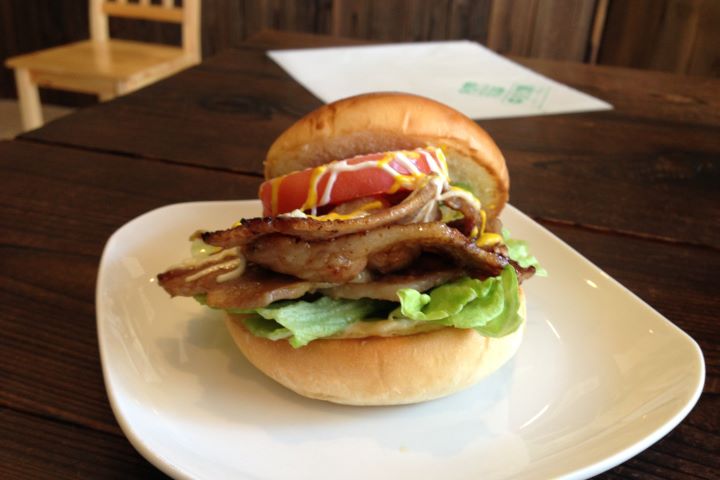 ▲以對馬名物「醬燒豬肉(とんちゃん)」製成的「對馬醬燒豬肉漢堡」。